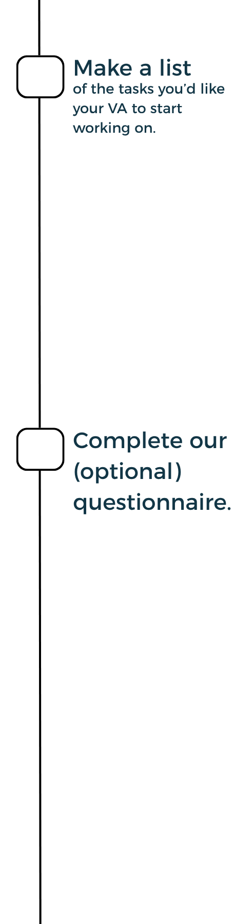 We’ll send you an optional questionnaire to complete before your kick-off call. This will help your VA understand more about you and how you like to operate. It includes details such as how you react when you’re stressed, what your pet peeves are and if you need a reminder to follow up on things.
